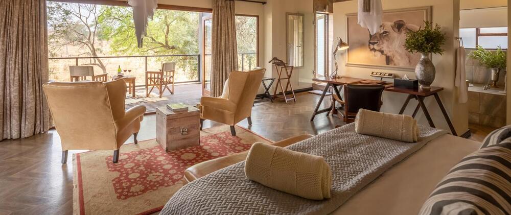 Deeply connected with the location's unrivalled backdrop, each air-conditioned safari suite boasts a high-impact design scheme incorporating both contemporary, bold visuals and elements from nature. A palette of silver, charcoal, and elephant grey ensures a relaxing and elegant setting to enjoy a secluded escape from the bustle of everyday life. The environment is both honoured and preserved, with the Lodge being carefully built around pre-existing trees to ensure as small a footprint as possible. This picturesque setting can be enjoyed from all angles, with private decks attached to each suite, a large main lodge deck, and a sunken fire pit, all offering excellent game-viewing opportunities. Support of local art also plays a significant role, with impressive South African art being celebrated on a gallery display wall in the communal area of the lodge.
