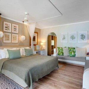 The resort’s rooms are located along the beach in 8 two-storey structures featuring traditional Creole architecture, and surrounded by tropical gardens. The interiors have been designed to uniquely identify with Praslin in every way, with vibrant tropical prints along with fixtures made from traditional materials like coconut husks. Each room has a private terrace or balcony. They can accommodate 2 adults and 1 teenager (12-17 years) or 2 adults and 2 children under 12. Ground floor rooms have connecting rooms for family requests.