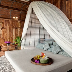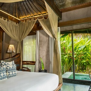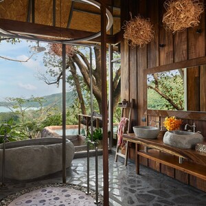 These tranquil tent-themed villas are nestled in the rainforest with sunset views and the soothing sounds of the jungle. The master bedroom enjoys forest and partial ocean views and the en-suite bathroom comprising monsoon shower, stand-alone tub and an outdoor shower provides luxurious bathroom amenities. The private pool on the deck is accessible directly from the bedroom.