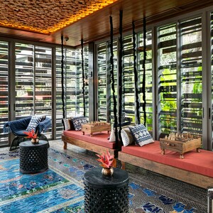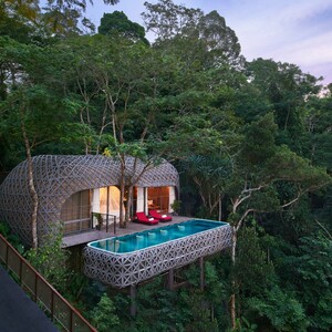 With two floors these spacious villas come with a private pool, an upper level master bedroom and a large lounge/dining area on the lower level. Unique interior design features include cocoon shaped beds and loungers, and furniture that hangs suspended from the ceiling. A spacious and luxurious bathroom features a monsoon shower, stand-alone bathtub and an outdoor shower. The pool is located on the terrace with commanding rainforest and resort views.