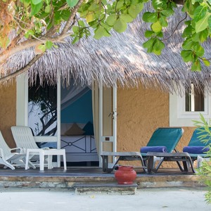 These beach villas have all you could need in a stylish and tranquil beach setting, perfect for your vibrant Maldives getaway. The wooden rooms feature a partially open-air bathroom with walk-in shower, double sinks and decorative wrought iron furniture.